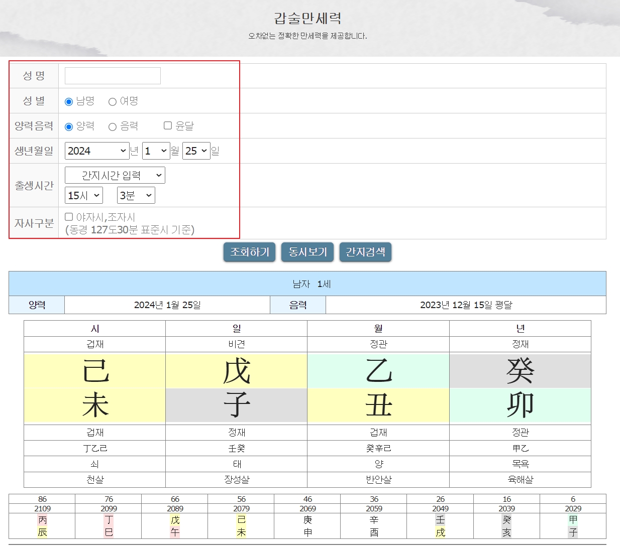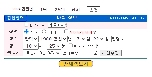 위 버튼 클릭 후 아래 사주플러스 만세력 사이트 하단에 보시면 아래와같이 개인 정보를 입력하는 칸이 나옵니다.