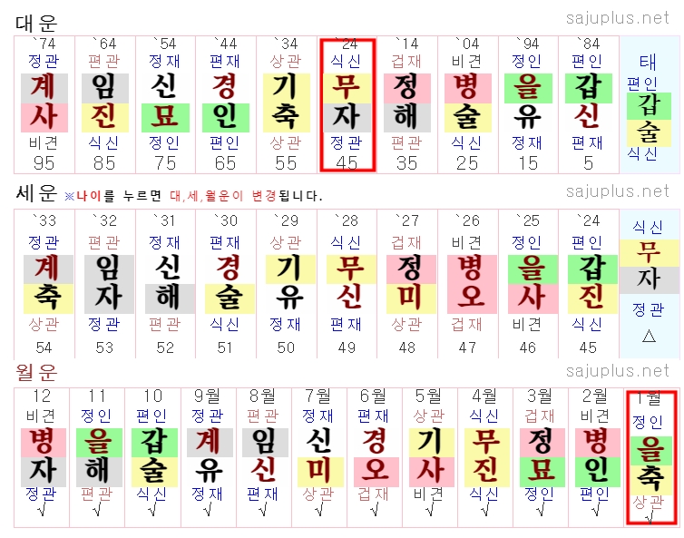플러스 만세력 역시 사주풀이가 되는데요, 아래와 같이 사주팔자를 통해 만세력을 확인해볼수 있습니다.