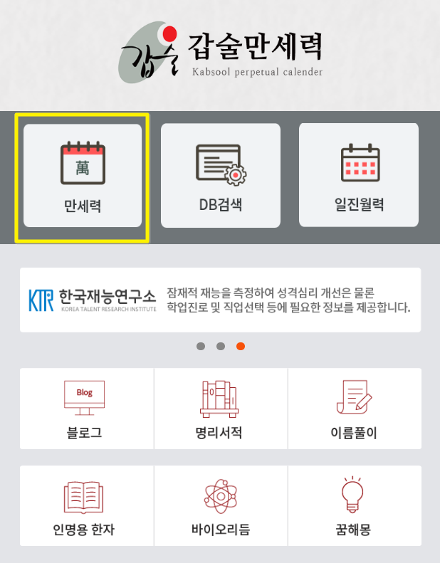 명리는 사람의 인생의 미래 예측에 도움을 주는 것 입니다. 갑술 만세력 사이트로 이동후 아래와 같이 만세력 영역을 클릭해주시기 바랍니다.