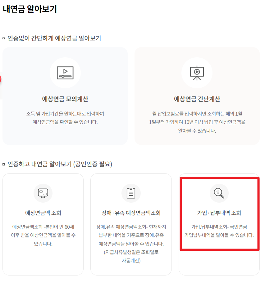 본인인증 후 [내연금 알아보기] > [가입 및 납부내역 조회]를 차례대로 클릭해주시기 바랍니다.