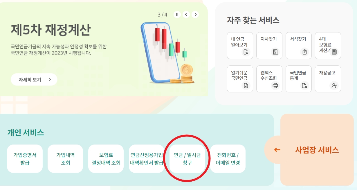 홈페이지로 이동하거나 모바일 앱을 통해 연금 / 일시금 청구 버튼을 클릭하시어 연금을 신청할 수 있습니다.