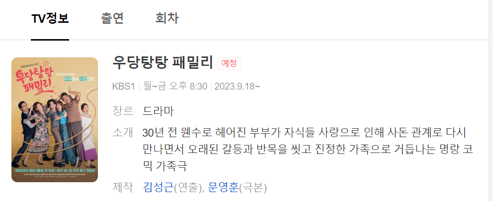 그 다음 2023년 9월 18일부터 시작되는 금이야옥이야 후속 드라마는 바로 우당탕탕 패밀리 입니다.
