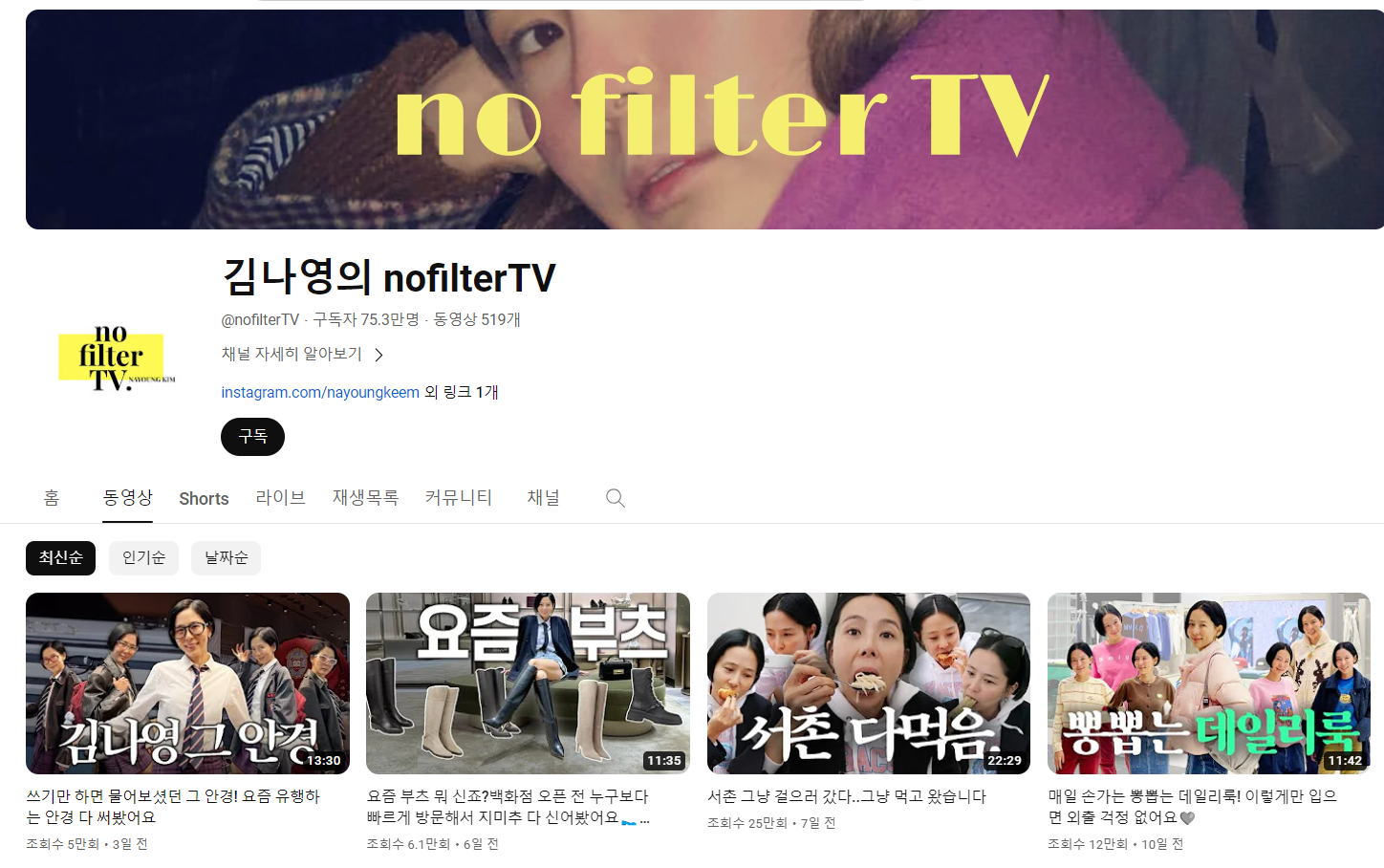 김나영은 노필터 TV라고 하는 유튜브를 운영하고 있으며 해당 유튜브를 통해 그녀가 어떤식으로 옷을 입는지, 그리고 추천템이라던지 데일리룩 등 여러가지 패션과 관련한 내용을 확인해볼 수 있습니다.