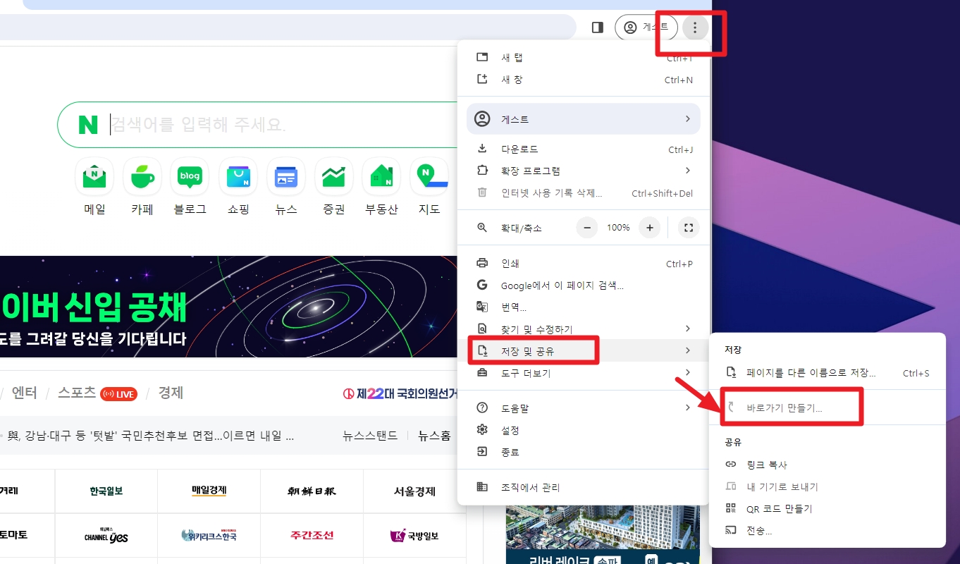 저는 크롬 기준으로 설명드리고자 합니다. 가장 상단에 [점 세개]를 클릭해준 다음 [저장 및 공유] 클릭, [바로가기 만들기]를 클릭해주시면 됩니다.