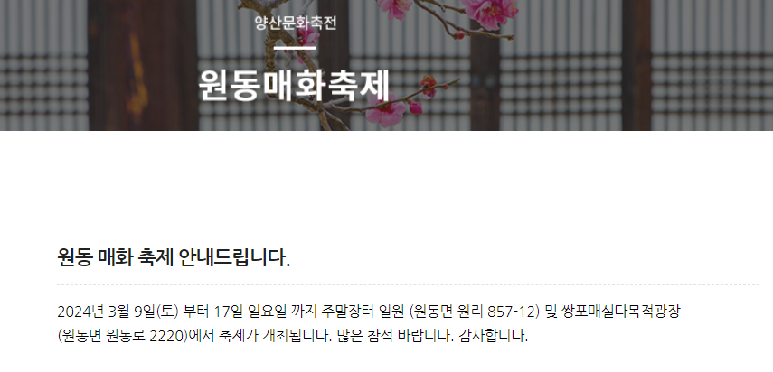 3월 9일부터는 원동면에서 진행되는 양산 원동 매화축제를 방문해볼 수 있습니다. 주말장터가 진행되고 매화의 열매인 토종 매실 등을 즐길 수도 있습니다.