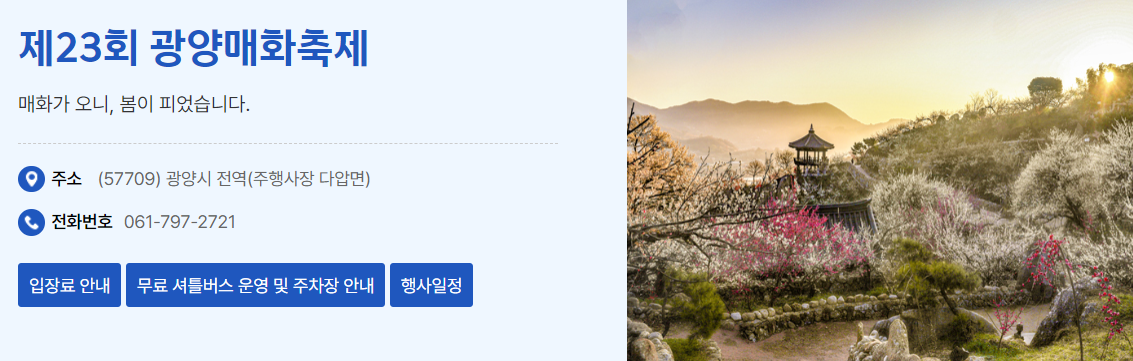 매년 광양에서는 100만명이 넘는 관광객들이 몰려옵니다. 이는 지리산 및 섬진강에 펼쳐져 있는 매화를 보기 위함인데요, 올해는 3월 8일부터 10여일동안 광양 매화 축제가 진행 될 예정입니다.