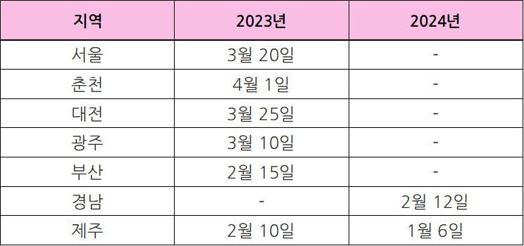 2023년 개화시기를 통해 우리는 2024년의 매화 개화시기를 확인해볼 수 있습니다.