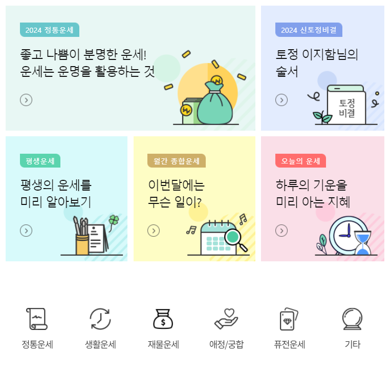 올해는 2024년 갑진년으로 풍요로운 해가 되기 위해서는 어떤 방식으로 임해야하는지 운의 흐름을 이 사이트들을 통해 확인해보시기 바랍니다.