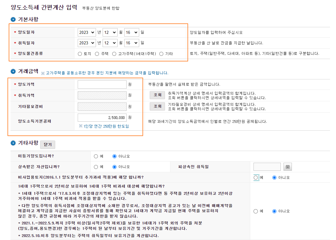 기본사항, 거래금액 외 다른 질문에 대한 내용만 간편하게 클릭하는 방식으로 계산기를 이용해볼 수 있어 매우 쉽고 편리합니다.