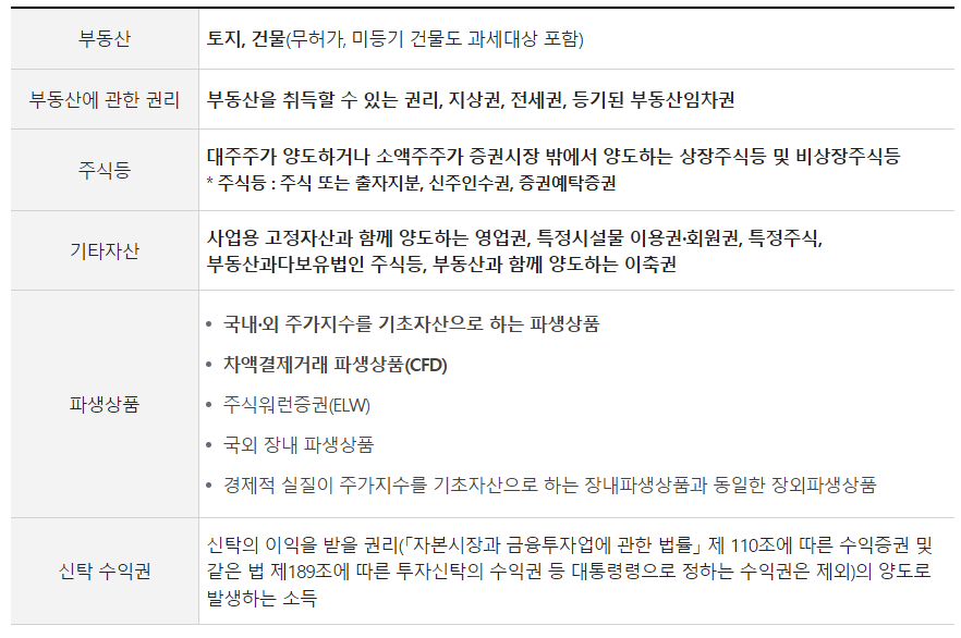 아래 각 양도소득세를 내야하는 재산의 유형을 확인해보시기 바랍니다.