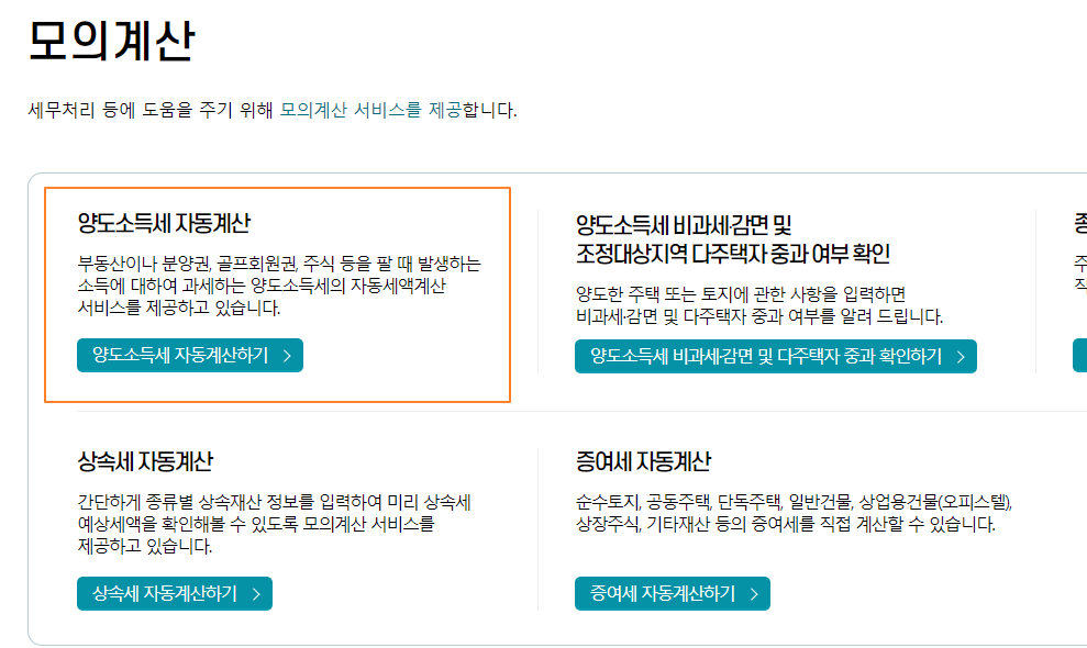 양도소득세 자동계산기는 버튼 클릭시 바로 확인이 가능합니다. 우리가 세무처리 등을 하기전, 간편하게 모의계산을 통해 내가 내야할 세액 등을 살펴볼 수 있는 서비스가 있기 때문입니다.