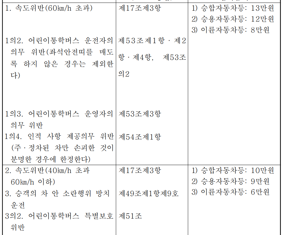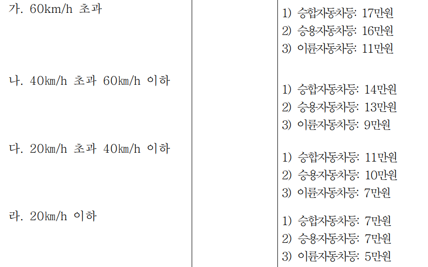 어린이보호구역 속도위반 범칙금은 과태료보다 1만원 가량 더 낮습니다. 아래 표를 참고하시어 속도위반시 차량 종류별 범칙금액을 확인해볼 수 있습니다.