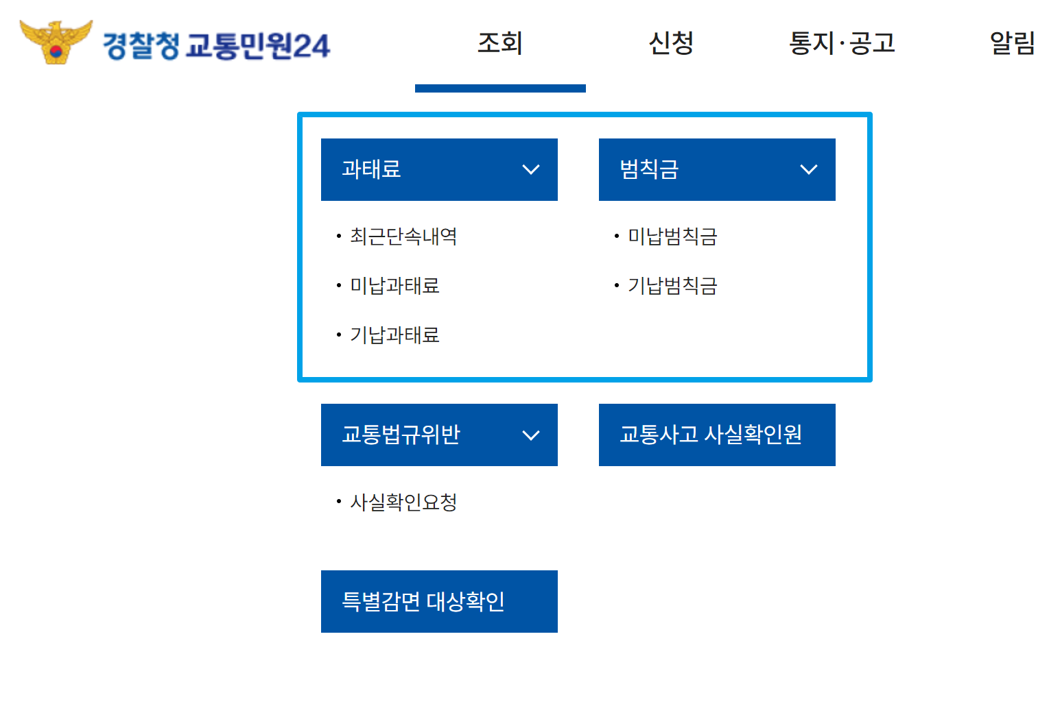 위 버튼 클릭 후 경찰청 교통민원 24 홈페이지로 이동, 아래와 같은 페이지에서 카테고리 상단 '조회' 버튼을 클릭하시면 아래와 같이 범칙금과 과태료를 확인해볼 수 있습니다.