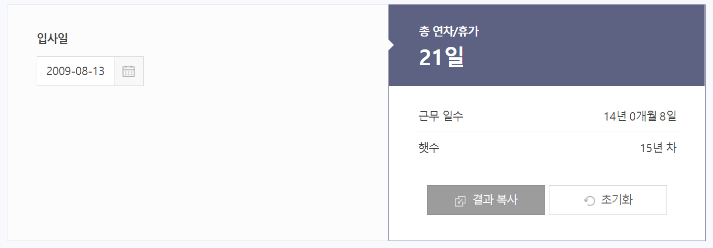 이렇게 늘어나지만 최대 25개까지만 연차가 있는 것 입니다. 연차 개수를 확인하는 것이 귀찮으신 분들은 아래 연차 계산기를 통해 계산해볼 수도 있습니다.