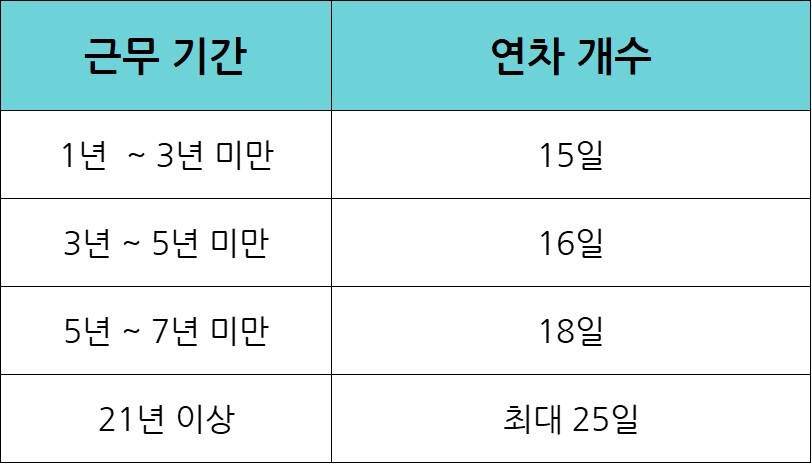 아래 표를 참고하시어 내가 근무한 기간에 따라 연차 개수가 어느정도나 되는지 체크해볼 수 있습니다.