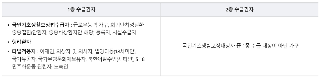 의료급여법 시행과 함께 1종과 2종으로 구분되는 의료급여 수급권자 대상자는 근로능력이 없는 1종과 1종 수급이 아닌 경우는 모두 2종에 해당하게 됩니다. 아래 표를 참고해보시면 되는데요, 이와같이 1종과 2종에 따라 구분되어 지원금 혜택이 다릅니다.