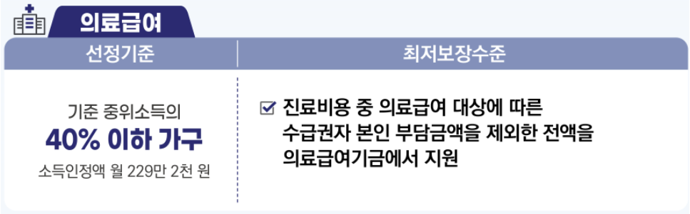 수급권자가 되기 위해 월229만 2천원이하의 소득인정액이 되어야 하는데요, 이와같이 의료급여 수급권자로 판단될 경우 아래에서 어떤 혜택을 받을 수 있는지 확인해보시기 바랍니다.