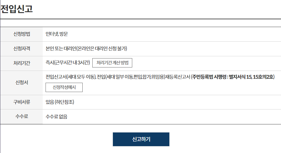 로그인 후 아래와 같은 페이지로 이동 후 '신고하기' 버튼을 클릭하시어 전입신고를 진행하시면 됩니다.