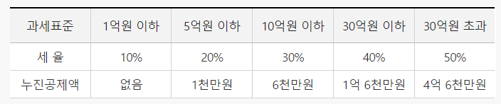 내가 받을 증여재산 금액이 크면 클 수록 세액 또한 함께 비례하여 올라가는데요 본인의 과세표준에 따라 증여세율이 어떻게 적용되는지 아래 증여세율표를 통해 확인해보시기 바랍니다.