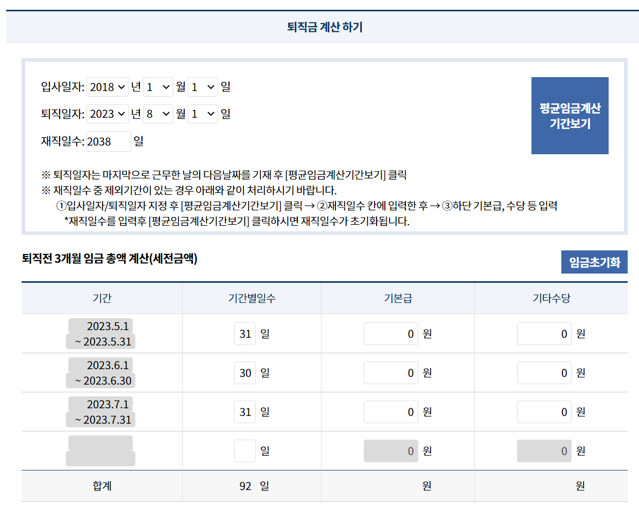 기본급 및 기타 수당을 기입해주면 3개월치의 평균 임금이 계산됩니다.