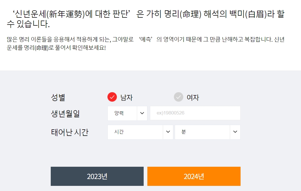 성별과 태어난 생년월일, 태어난 시간 등을 입력 후 2024년을 클릭하시어 운세를 확인해보시기 바랍니다.