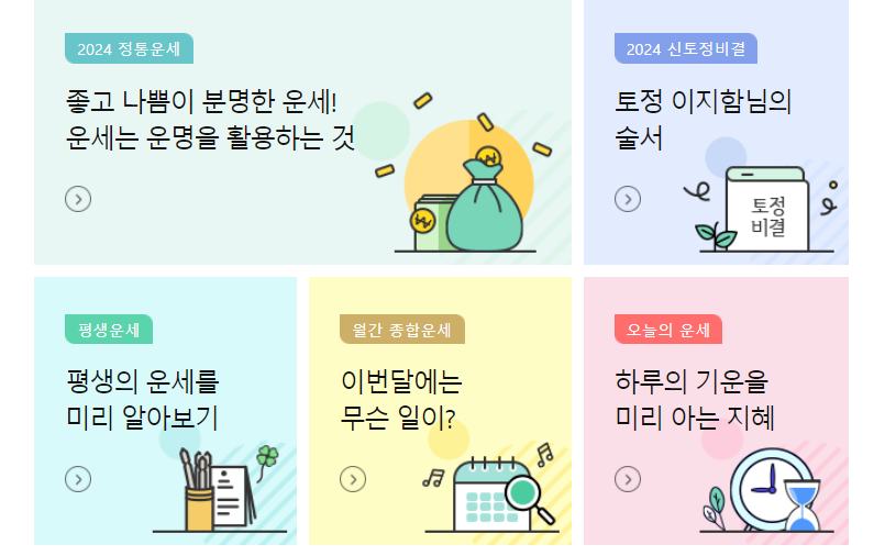 아래 내가 원하는 메뉴로 이동하시어 모든 서비스를 이용할 수 있습니다. 정통운세부터 재물, 생활, 애정, 궁합, 그리고 꿈 해몽까지 확인해볼 수 있어 시간이 매우 잘가기 때문에 저도 자주 이용합니다.